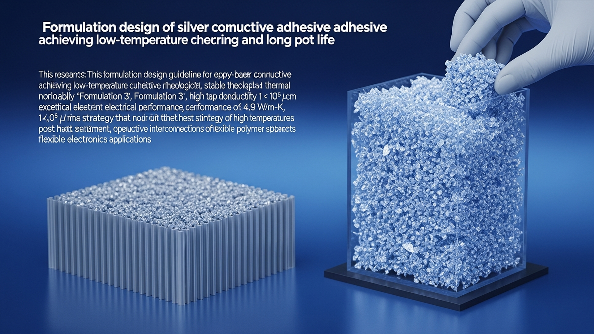 研究では、エポキシ樹脂、硬化剤、銀フィラーの選択とその配合比率を体系的に検討することで、低温硬化性、長期ポットライフ、安定したレオロジー特性、そして優れた電気・熱性能を両立させる配合設計ウィンドウを特定しました。特に、高タップ密度(かさ密度)の銀フレークを最適に分散させた「配合3」は、その性能において顕著な結果を示しています。この配合は、体積抵抗率1 × 10−5 Ω·cmという極めて低い電気抵抗と、4.9 W/m·Kという高い熱伝導率を同時に達成しました。これらの高性能は、一般的な導電性接着剤で必要とされる高温での焼結や後熱処理なしに、低温での硬化プロセスによって実現された点が大きな特長です。これにより、熱に弱いフレキシブル基板への適用が容易になります。