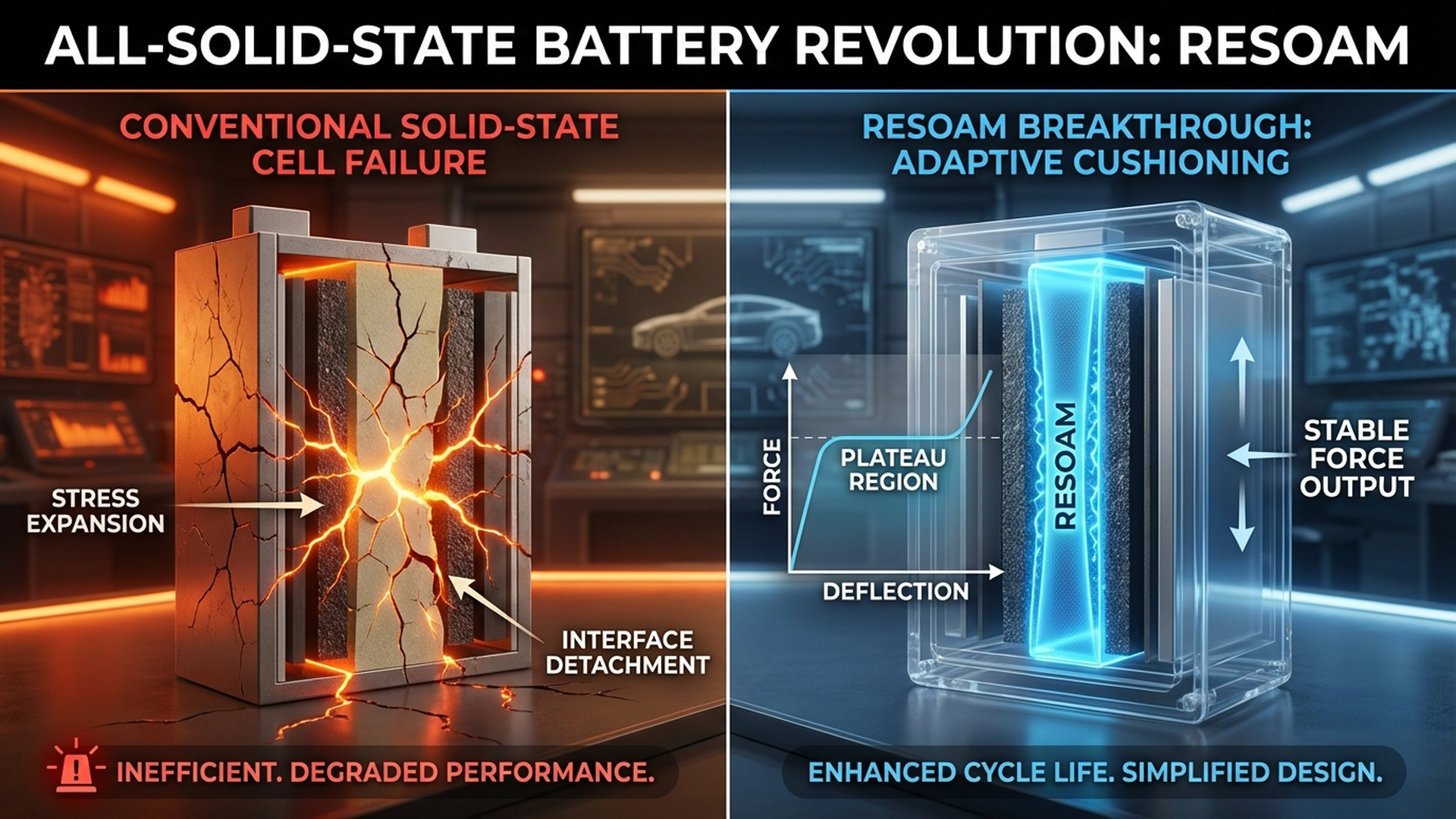 従来のゴムやスポンジでは、圧縮すればするほど反発力が強くなりすぎてしまい、全固体電池の複雑な体積変化に対応しきれないという課題がありました。