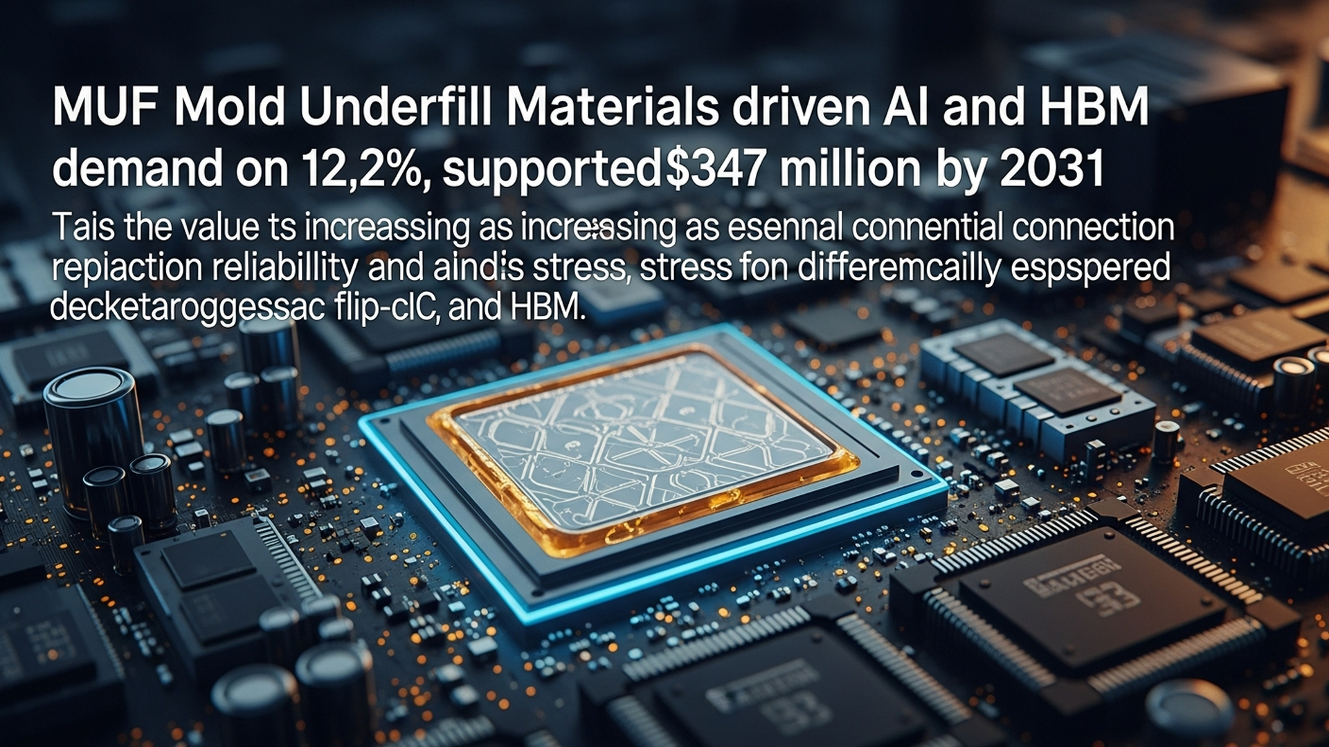 MUFモールドアンダーフィル材料は、チップと基板間の微細なギャップを均一に充填し、バンプ接続部を機械的・熱的ストレスから保護する特殊な樹脂ベースの材料です。従来のキャピラリフローアンダーフィル(CUF)と比較して、MUFはアンダーフィル充填プロセスとモールド(封止)プロセスを統合できるという大きな技術的利点があります。これにより、製造工程の簡素化、タクトタイムの短縮、および製造コストの削減が期待できます。MUFは、熱膨張係数をチップや基板に近づけることで、熱ストレスによるバンプ疲労を軽減し、接続部の信頼性を飛躍的に向上させます。また、高充填が可能なため、優れた熱伝導性を発揮し、デバイスの発熱を効率的に拡散する役割も担います。市場調査レポートによると、AIおよびHBM需要の拡大を背景に、MUF市場は2031年までに3億4700万ドル規模に達し、年平均成長率(CAGR)12.2%で急成長すると予測されています。